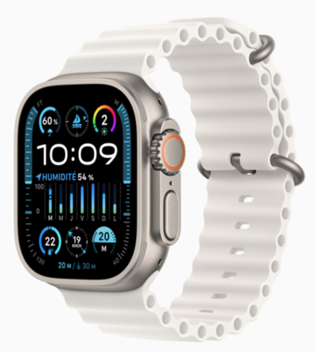L’Apple Watch Ultra 2 est taillée pour offrir des performances inégalées. Son boîtier en titane, à la fois léger, robuste et anti‑corrosion, présente des bords surélevés pour protéger l’écran en verre saphir des impacts latéraux.
